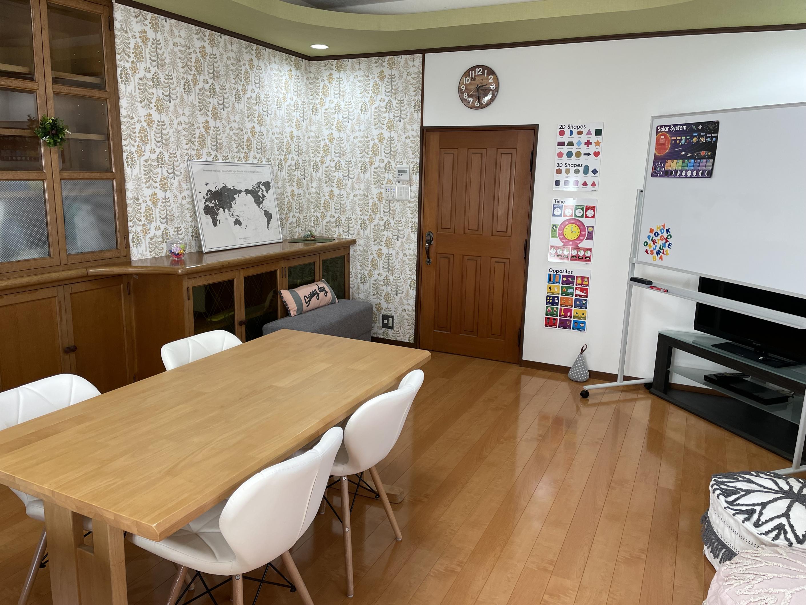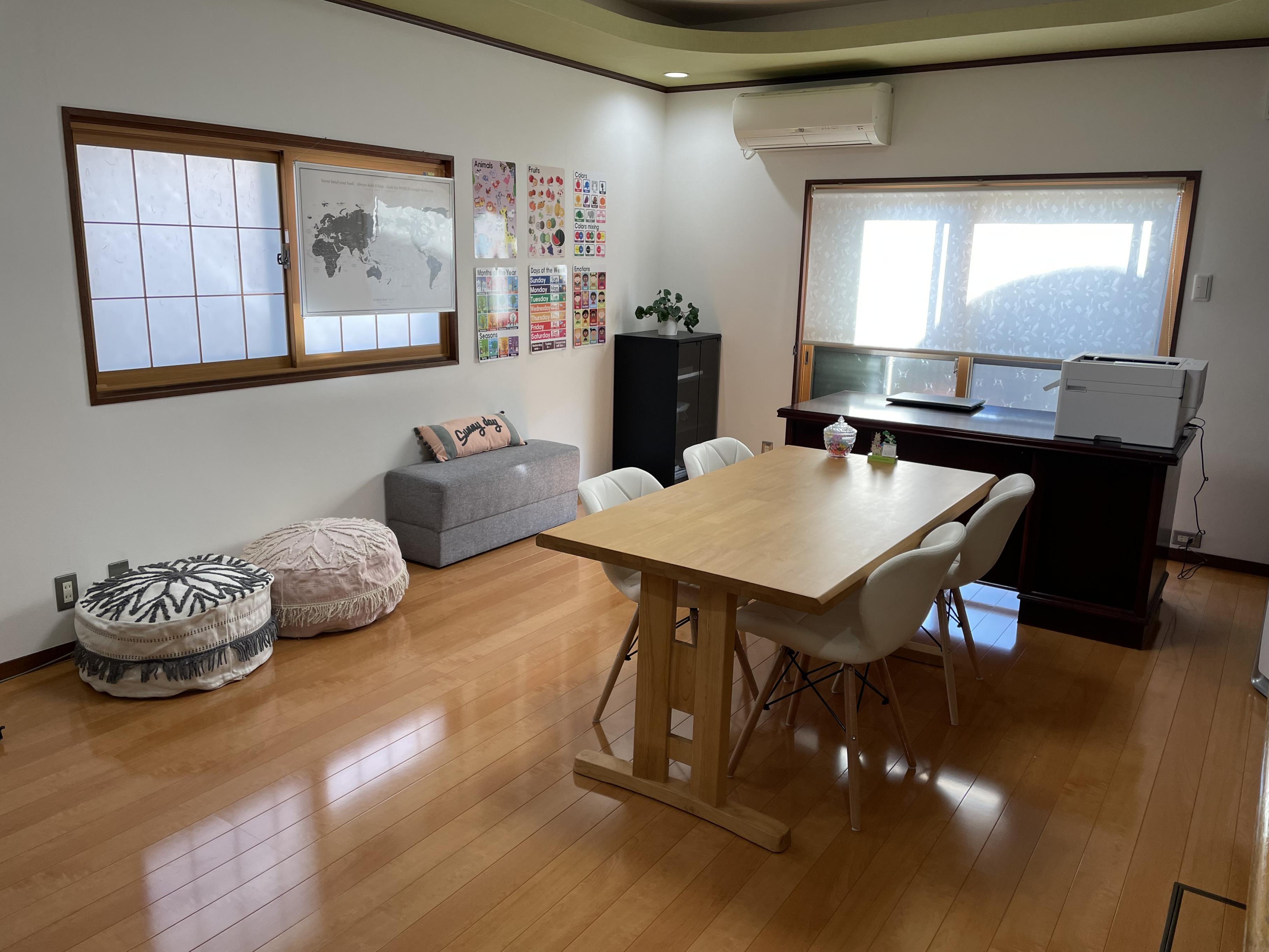 お庭が目の前の南東に位置する教室は1年を通してお日様の光いっぱい、床暖房・空気清浄機・加湿器完備のお部屋です。